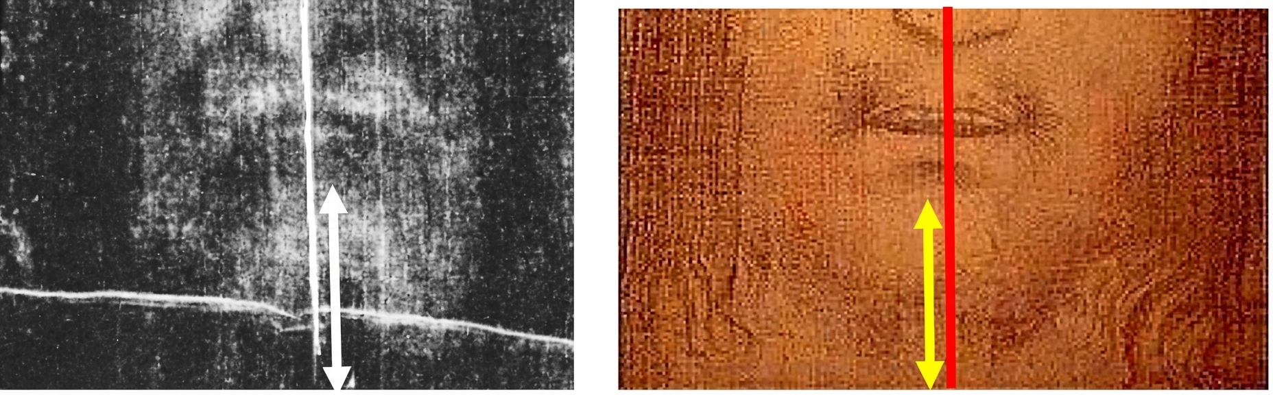 Dans notre étude, nous avons pu déterminer avec précision la largeur et surtout la hauteur du visage du Linceul. Cependant, nous ne retiendrons pas la largeur. Si, sur le Linceul, les deux côtés du visage ne sont pas visibles à partir des pommettes, il a quand même été possible de reconstituer cette largeur. Mais l’imprécision étant trop importante sur le Voile de Manoppello, il y a donc une grande marge d’erreur sur ce point, rendant invalide toute déduction. Aussi ne sera-t-il retenu que la dimension verticale du visage dont la lecture est parfaitement lisible sur les deux images, et cette comparaison sera suffisante par elle-même. Rappelons que la dimension d’un visage dans son sens vertical se lit sur l’axe médian partant du contour inférieur du menton à la racine des cheveux sur le haut du front.