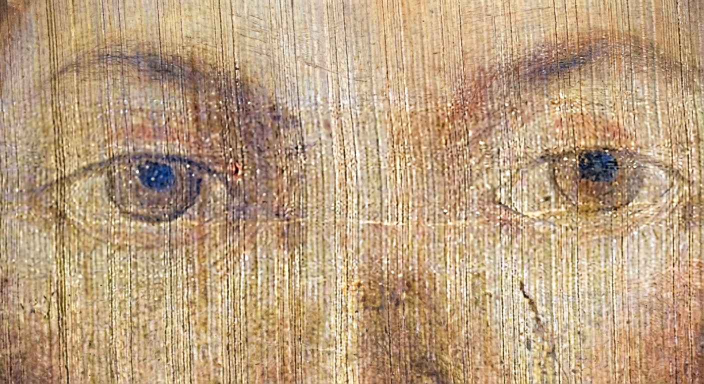 - L’iris des deux yeux semble avoir fait l’objet d’une retouche sur toile sèche, particulièrement celui situé à gauche de l’image.
