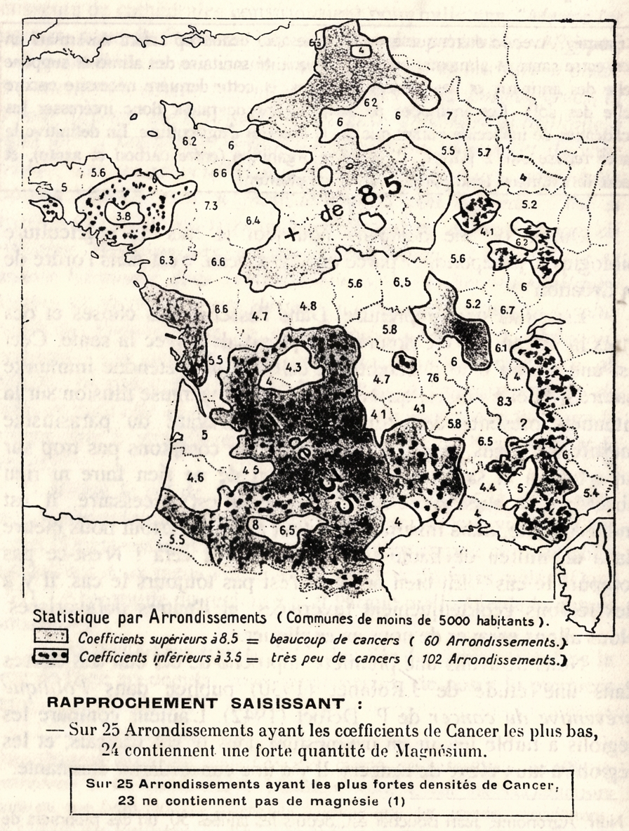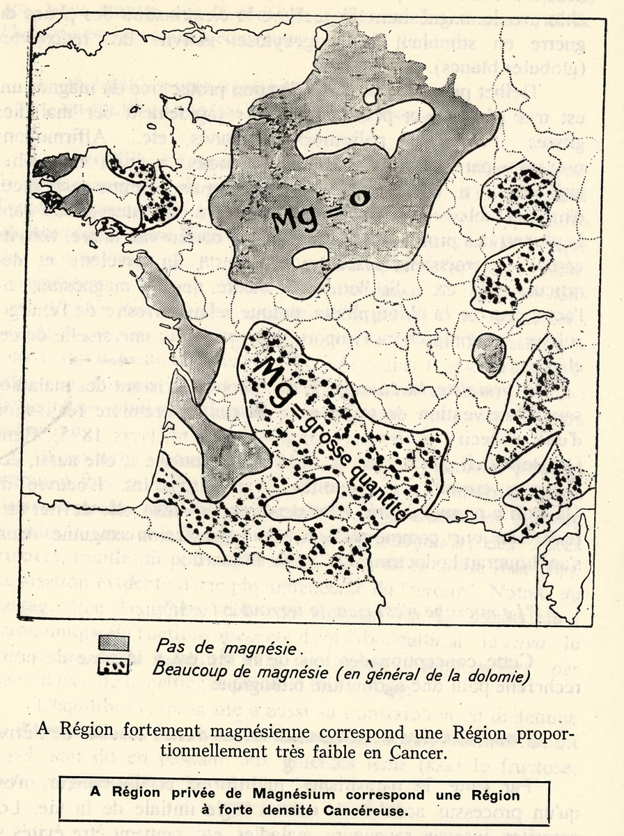 Nous trouvons une première approche de cet état des choses dans une étude de J.Robinet (1930) publiée dans Politique préventive du cancer de P. Delbet (1942). L’auteur compare les régions à faible teneur en magnésium dans le sol français, et les régions à taux élevé de cancers. Il y a une concordance étonnante. Au contraire, les régions à sol riche en magnésium, sont des régions à faible taux de cancers. Le taux des suicides est lui aussi peu élevé, et la longévité accrue, si on la compare à celle des régions à sol pauvres en magnésium.