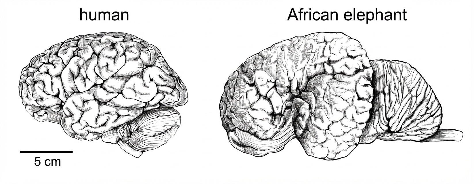Nous, les éléphants, sommes conçus dès l'origine avec un système nerveux très développé : le primatologue R. Dubar indique qu'aucune variante écologique ne peut entraîner l'agrandissement du cerveau.