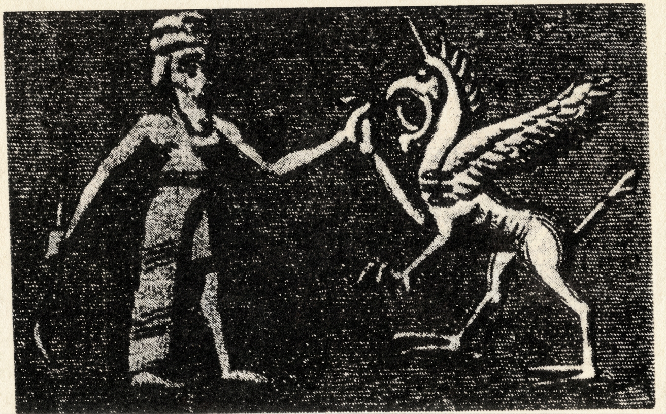 Fig 1. La prise utilisée par Beowulf pour tuer Grendel était-elle si nouvelle ?.. Cette gravure sur un antique sceau babylonien montre un homme saisissant le membre antérieur d’un monstre en vue de l’amputer.
