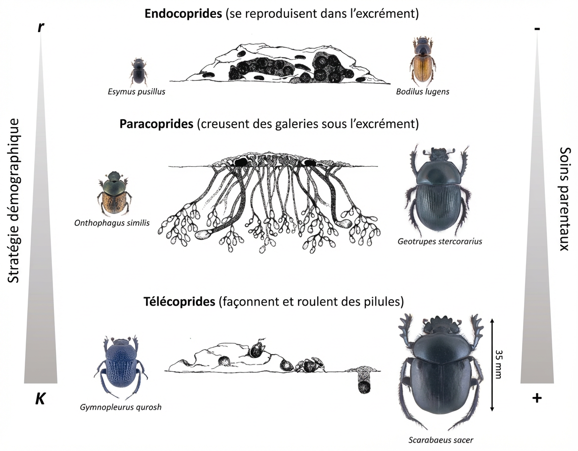 Schéma des catégories de bousiers suivant leurs comportements alimentaire ou reproductif.