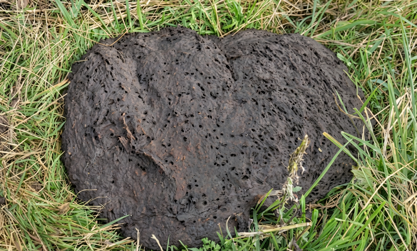 Bouse percée de trous de bousiers (à gauche) - Larves dans une déjection plus ancienne (à droite) ; un bousier adulte est présent en haut de l’image, sur le site noir.