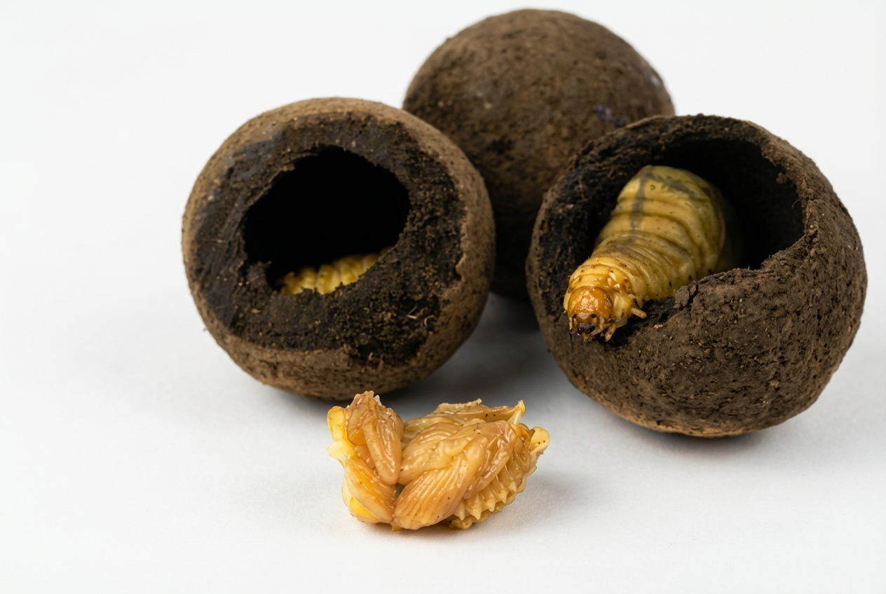 Pilule de bousier et sa larve.