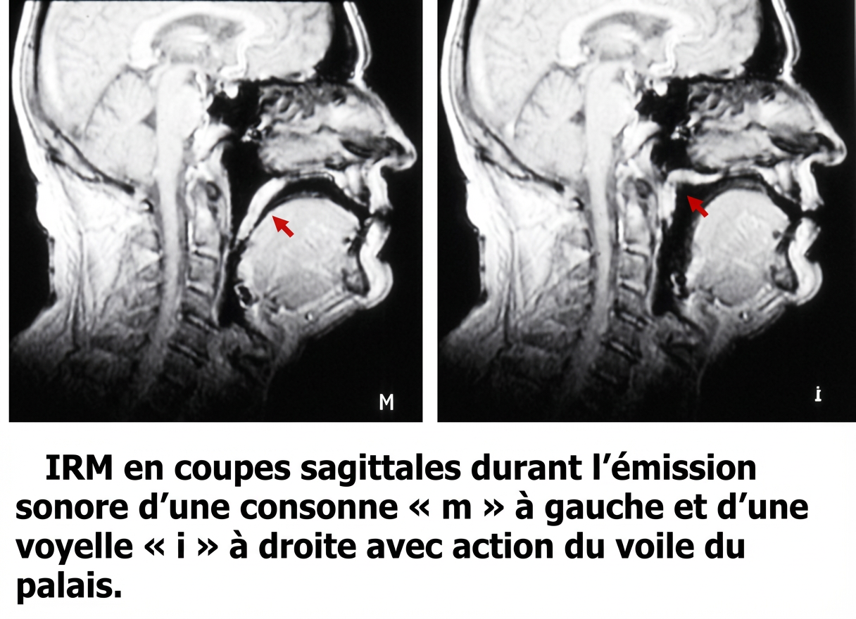 Figure 5 : rôle articulatoire du voile du palais et de la langue. Imagerie par résonnance magnétique (IRM) de l’émission d’une consonne nasalisée « m » à gauche et d’une voyelle « i » avec dans ce cas, contraction du releveur du voile tirant celui-ci vers l’arrière et fermant le naso-pharynx sans ouvrir la trompe auditive.
