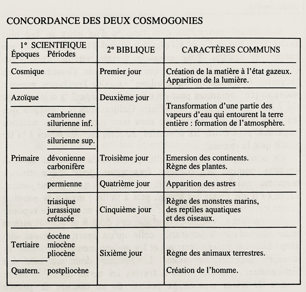 Le concordisme eut son heure de gloire puisque le grand « Dictionnaire de la Bible » (1895-1899) publié sous la direction de Vigouroux comporte plusieurs articles « concordistes ». Ainsi l’article « Cosmogonie mosaïque » donne le tableau suivant où les jours de la Création sont rapportés aux ères géologiques sous le titre général « Concordance des deux cosmogonies ».