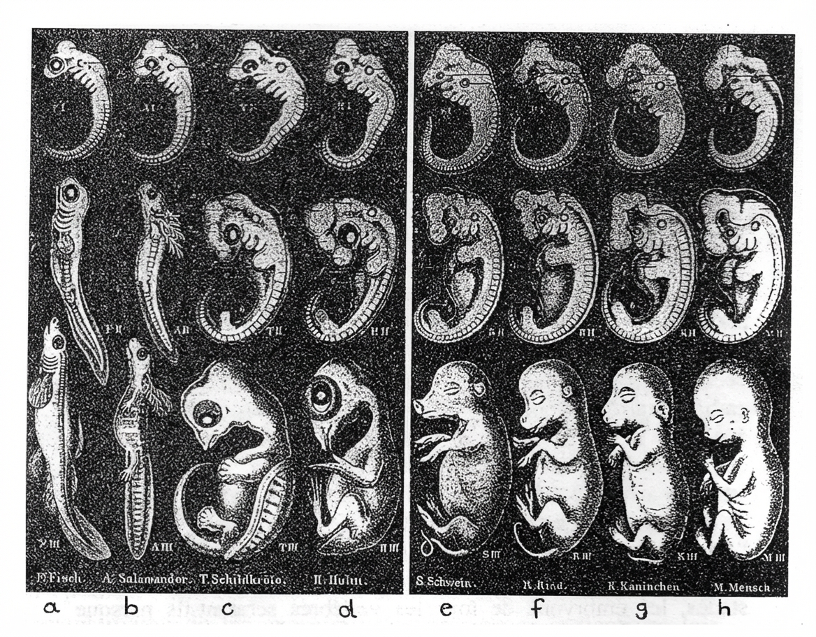« Pourquoi l’embryon d’un mammifère et celui d’un reptile passent-ils par des stades qui se ressemblent ?…Parce que, écrit Darwin, l’embryon est l’animal dans son état le moins modifié et cet état révèle la structure de ses ancêtres. » Pour Darwin la similitude entre les embryons des animaux et de l’homme était la meilleure preuve de l’Évolution. Alors vint Haeckel (1834-1919), biologiste allemand surnommé « l’apôtre du darwinisme en Allemagne. » Il devint célèbre par sa « loi » affirmant que « l’ontogenèse récapitule la phylogenèse », c’est-à-dire que l’embryon humain passe par tous les stades représentant ses ancêtres depuis la cellule initiale jusqu’à l’homme.