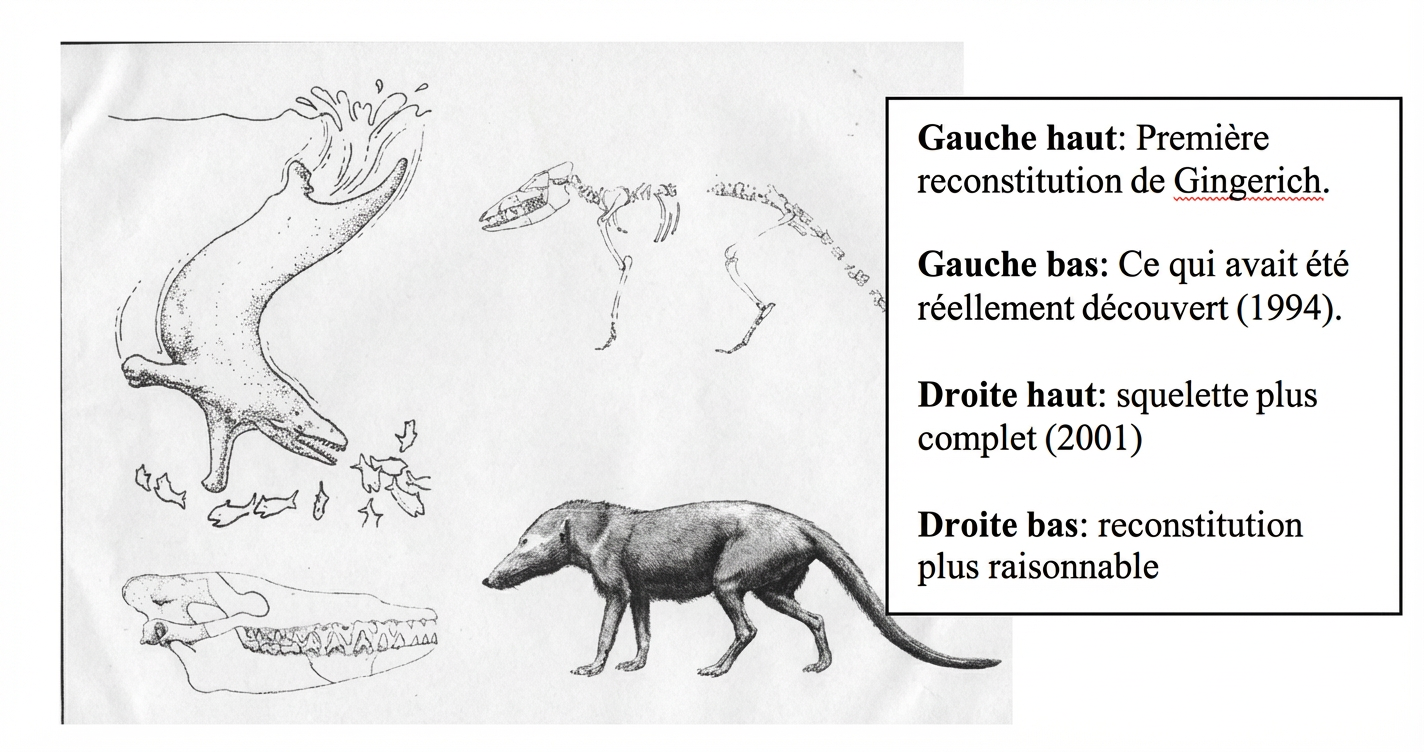 Le Pakicetus dont parle l’article, fut découvert en 1983 par Gingerich. En fait, il n’avait trouvé qu’une mâchoire et un crâne. En 1994, Gingerich déclara que Pakicetus était l’intermédiaire parfait entre un animal terrestre et une baleine9. Un artiste dessina alors une reconstitution montrant un animal nageant dans l’océan avec des pattes antérieures comme celles d’un animal terrestre, mais une gueule et un arrière-train à la manière d’un animal marin.