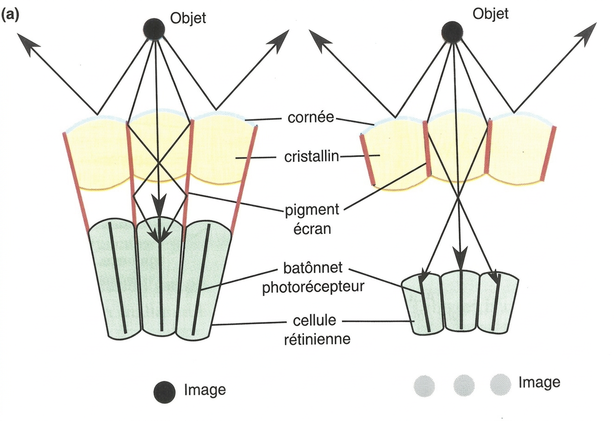 Chez le Criquet, les pigments écrans dispersés isolent chaque ommatidie de ses voisines. La lumière en provenance d’un point du champ visuel traverse la cornée et le cristallin d’une ommatidie et ne vient stimuler que le bâtonnet photorécepteur de cette ommatidie.