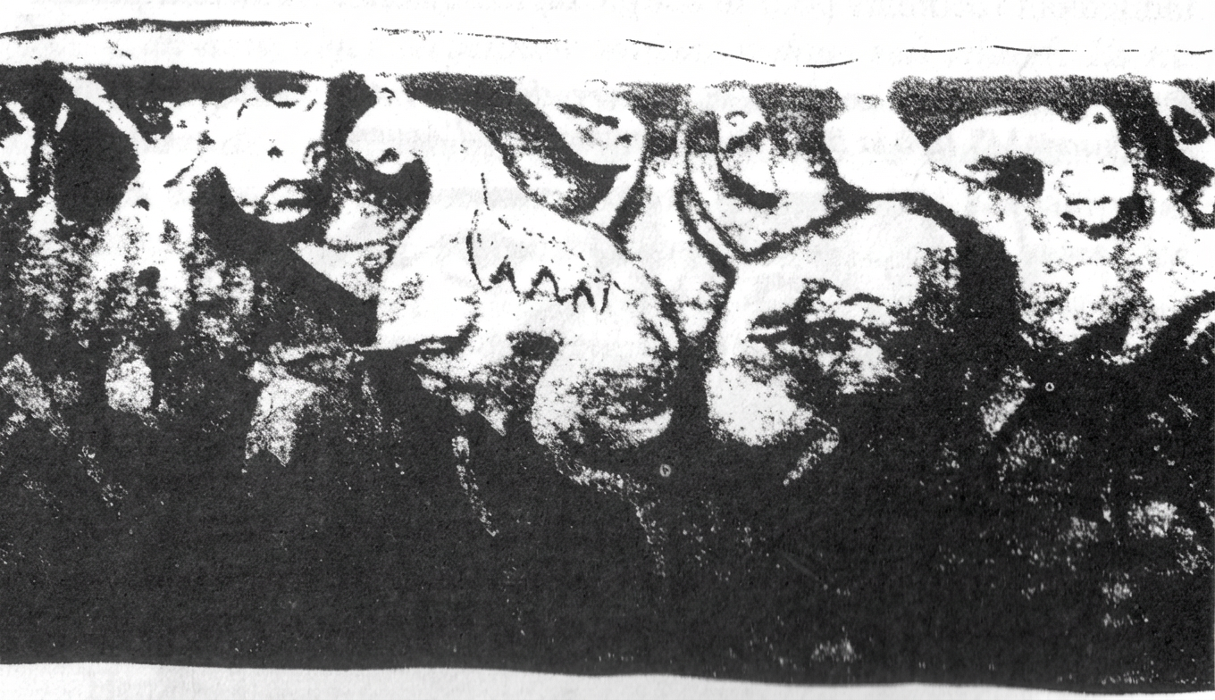 Fig.2 : Attaque d’un troupeau de dinosaures (type Brontosaurus) par un prédateur bipède. En haut des flancs de ce dernier, on distingue les bords d’une carapace (un tel détail figure dans le récit de Beowulf, cf. Le Cep n° 21 à paraître).