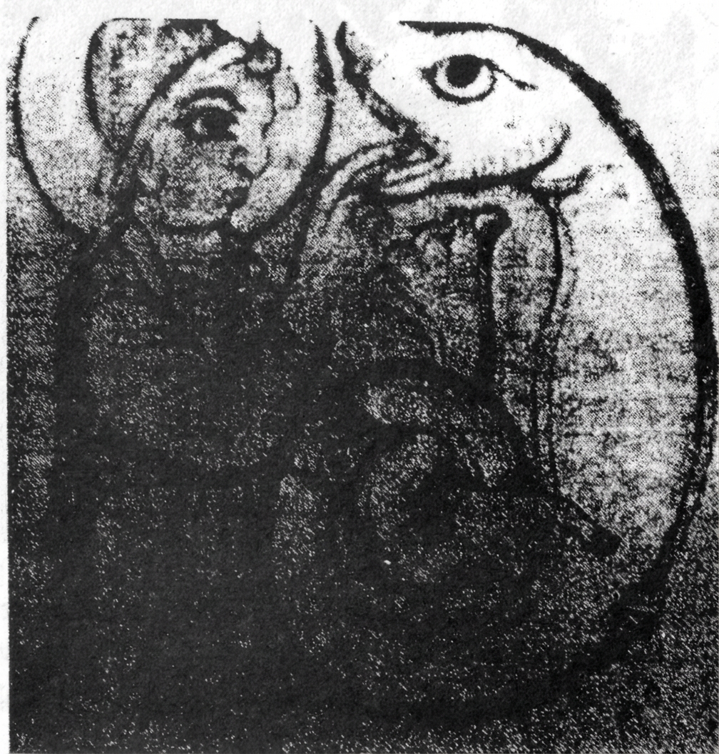 Ici est représenté un reptile volant, connu des Saxons sous le nom de widfloga. Remarquez les longues mâchoires fortement dentées et les ailes repliées le long des côtés. La forme de la tête est également intéressante. Ne connaissons-nous pas un reptile volant fossile ayant cette forme et ces traits ? Nous rencontrerons bientôt son semblable dans un récit écrit.