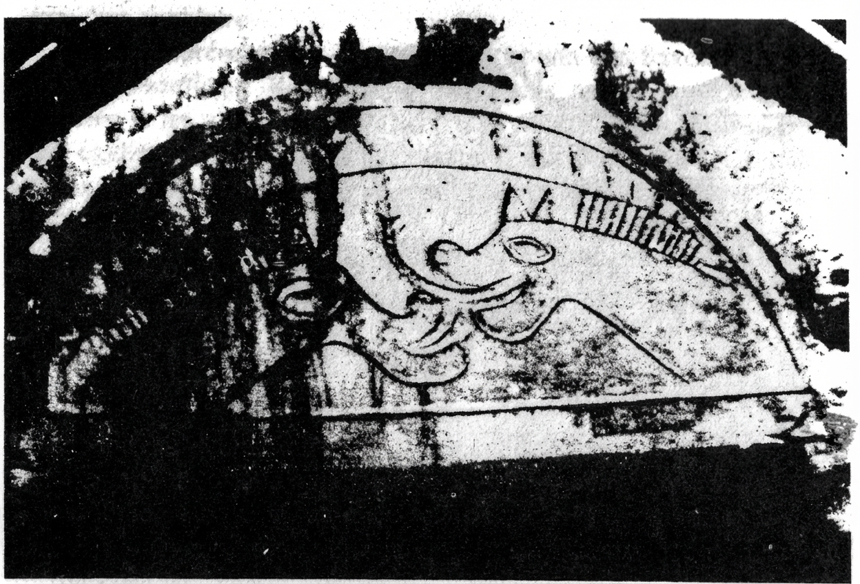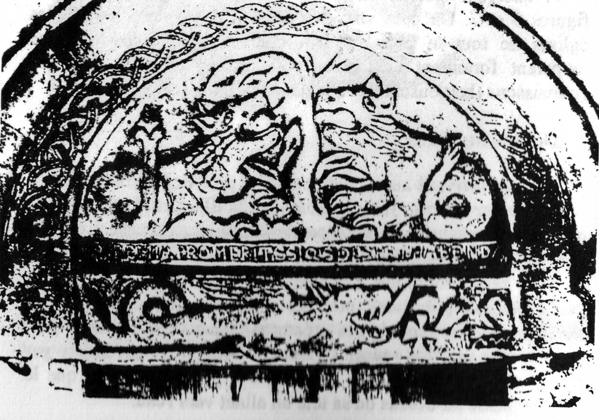 Fig. 7a : Tympan de l’église paroissiale de Dinton dans le Buckinghamshire. Ces créatures bipèdes avec leur longue queue induisent un rapprochement avec l’illustration 7b.