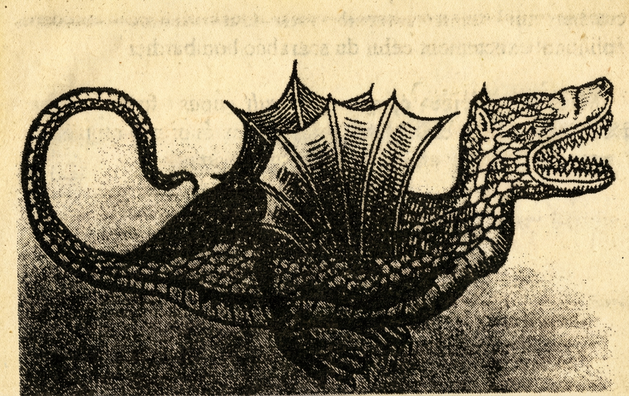 Fig. 7b : Illustration extraite de « l’Histoire des Serpents » d’Edward Topsell (publiée en 1608). Mis à part les ailes, on note une étonnante ressemblance avec les reconstitutions du Tyrannosaurus.