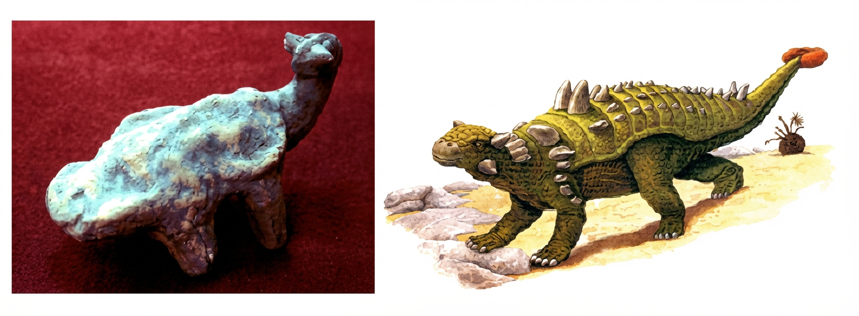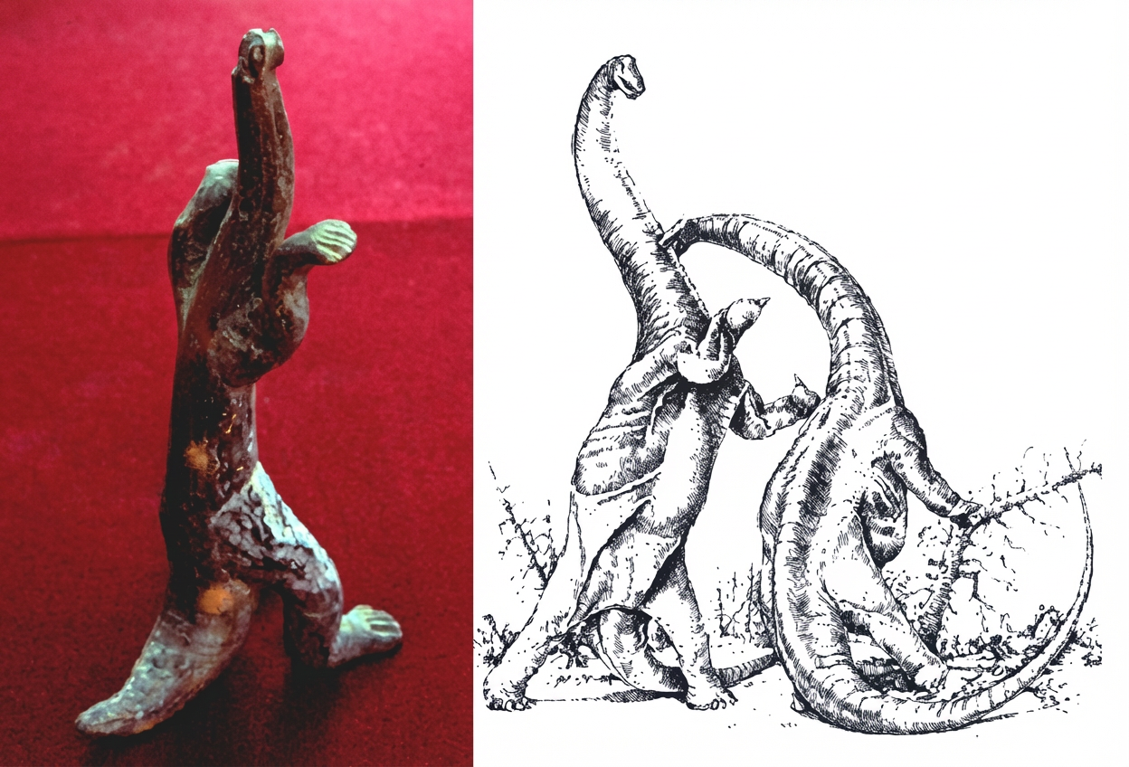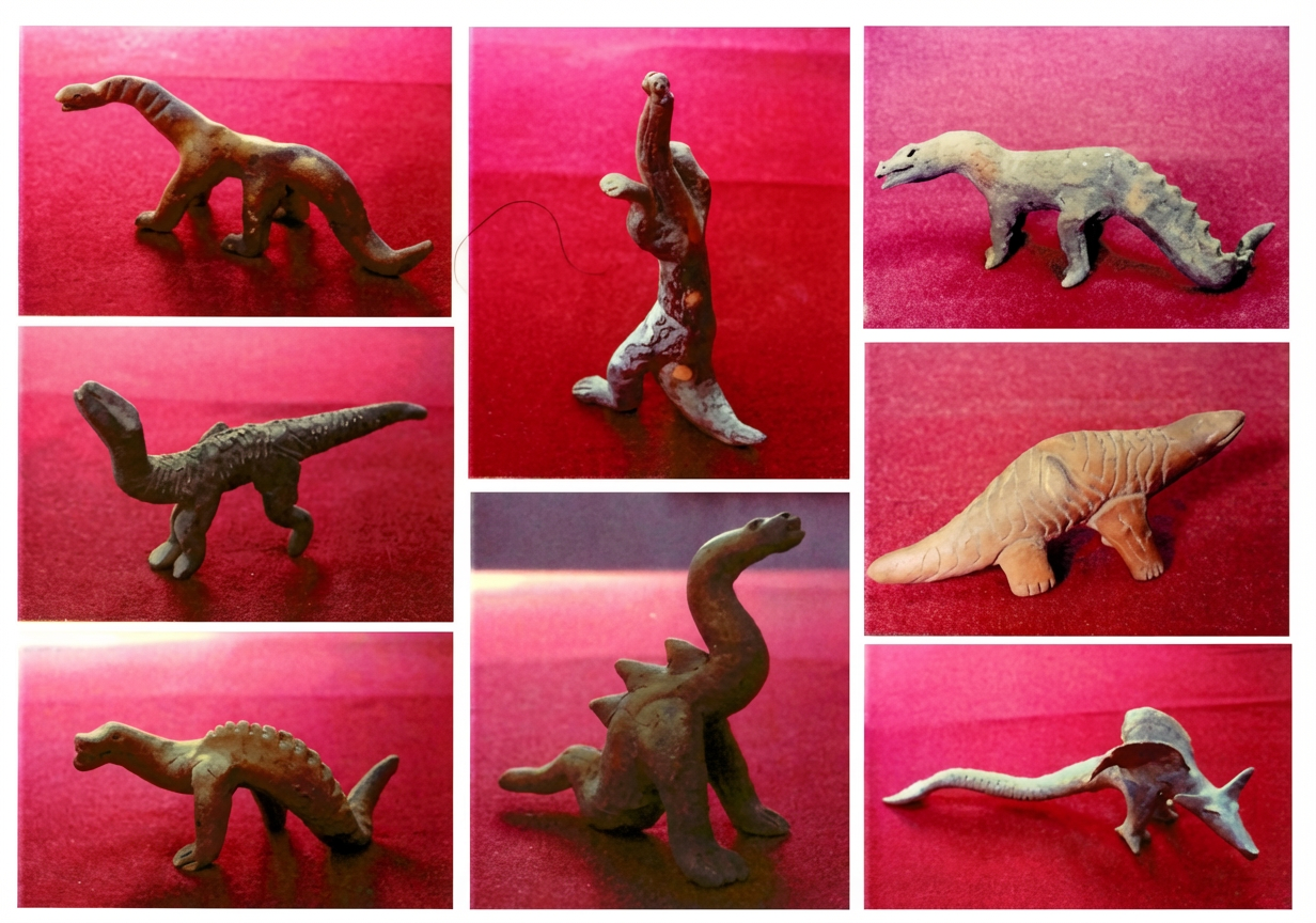 Ces fantastiques figurines de dinosaures menacent les idées admises et les échelles de temps de plusieurs champs d’étude. En 1955, Ivan T. Sanderson, Ph.D, fut étonné de découvrir dans cette collection une représentation précise de son dinosaure américain, le brachiosaure, qui était presque totalement inconnu du public à l’époque. Sanderson écrivit : « Cette figurine est une pièce très délicate; elle a l’air polie et est d’un noir de jais. Elle mesure environ 30 centimètres. Ce qui est fascinant, c’est qu’il s’agit d’une représentation absolument parfaite du brachiosaure, découvert uniquement en l’Afrique de l’Est et en Amérique du Nord. Il y a plusieurs représentations de squelettes dans la documentation publiée, mais je n’ai jamais vu qu’une reconstitution en chair. Cette figurine lui ressemble tout à fait.»