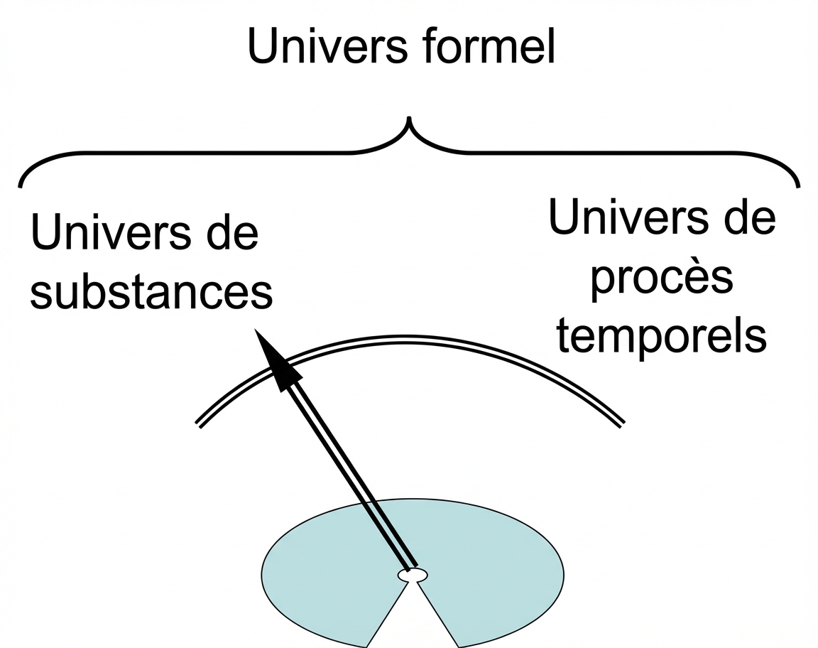 Donc, après avoir été dans un univers de notions, on va se trouver : ou dans un univers de substances pour avoir un substantif ; ou bien dans un univers de procès temporels pour avoir un verbe. Il faut trancher.