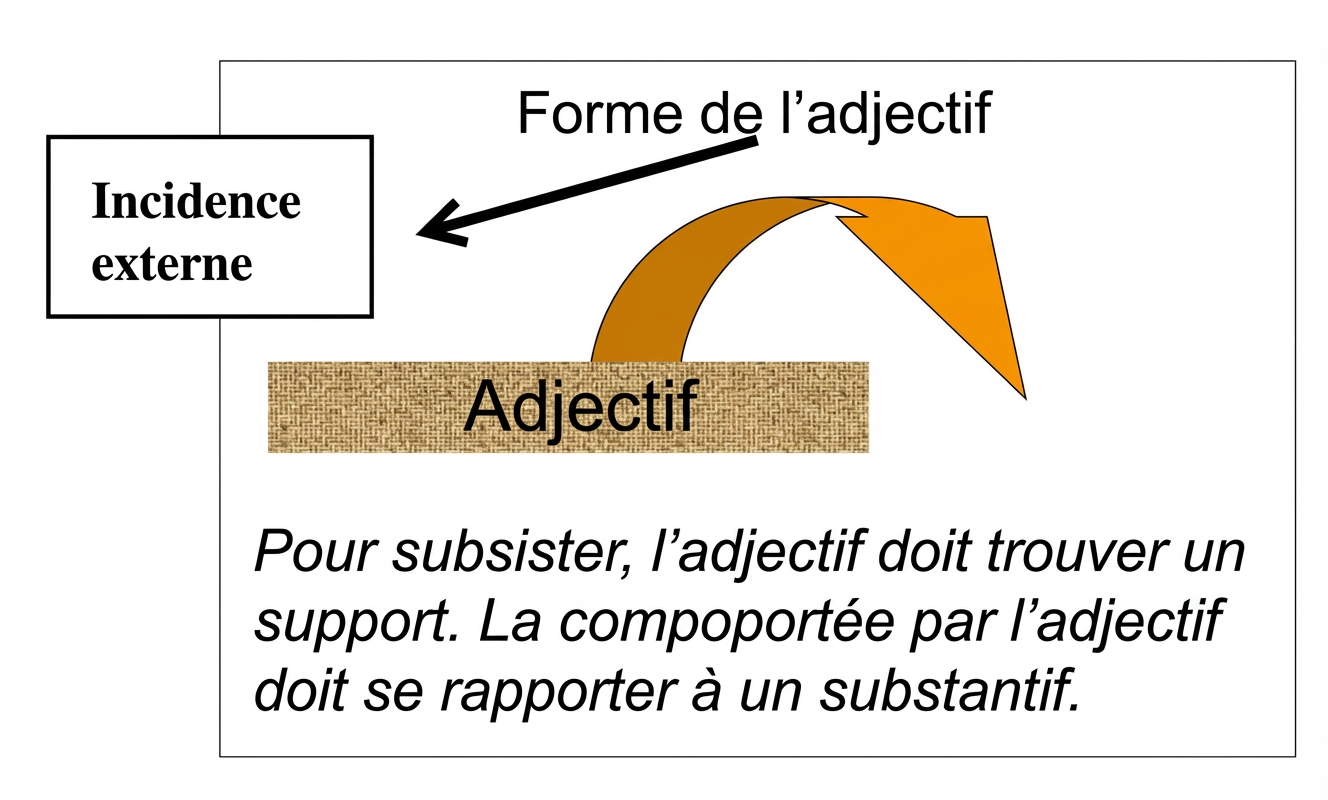 De par sa forme, l’adjectif ne peut subsister par lui-même. Il doit être rapporté à un substantif. On ne conçoit pas l’accident sans rapport au substantif. L’être de l’accident consiste dans son inhérence. Sa forme est celle d’une incidence externe.