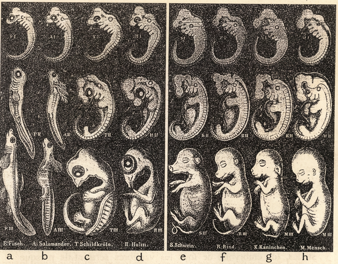 Dès en 1868, L.Rutimeyer, Professeur de zoologie et d’anatomie comparée à l’Université de Bâle, avait contesté l’exactitude des dessins de Haeckel. Ce dernier, convaincu de fraude par cinq de ses pairs devant un jury de l’Université d’Iéna, dut admettre que nombre de ses dessins avaient été « reconstruits » et « schématisés. »7