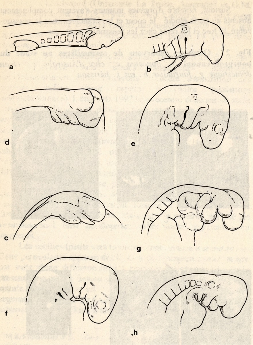 Fig. 2 . Quelques embryons de mammifères au stade du bourgeon caudal. b : opossum, c : chat d’Australie, e : chien domestique, g : fourmilier, h : rat, j : hérisson.