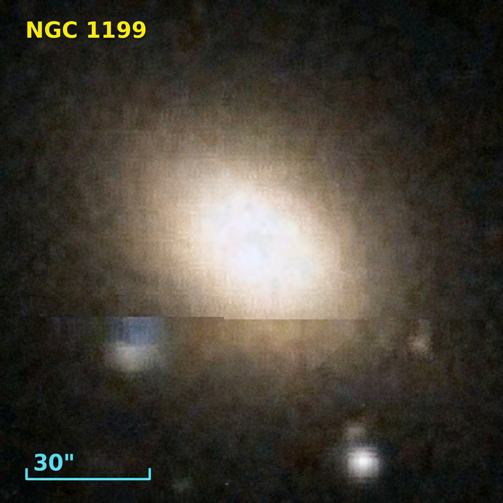 Le second cas est celui de la Galaxie NGC 1199. Sur l’image, on aperçoit une galaxie centrale et une autre galaxie qui nous apparaît comme à l’avant de la première (donc plus proche). Or, en interprétant V selon l’effet Doppler, la galaxie du fond affiche une vitesse de fuite (V) de 2 700 km/s (distance = 125 millions d’a. l.), alors que la galaxie à l’avant aurait une vitesse de fuite de 13 300 km/s (distance = 619 millions d’a. l.). L’illogisme auquel cela nous conduit est le suivant : la galaxie à l’avant se trouverait, selon la loi de Hubble, plus éloignée de 500 millions d’années-lumière que la galaxie du fond !