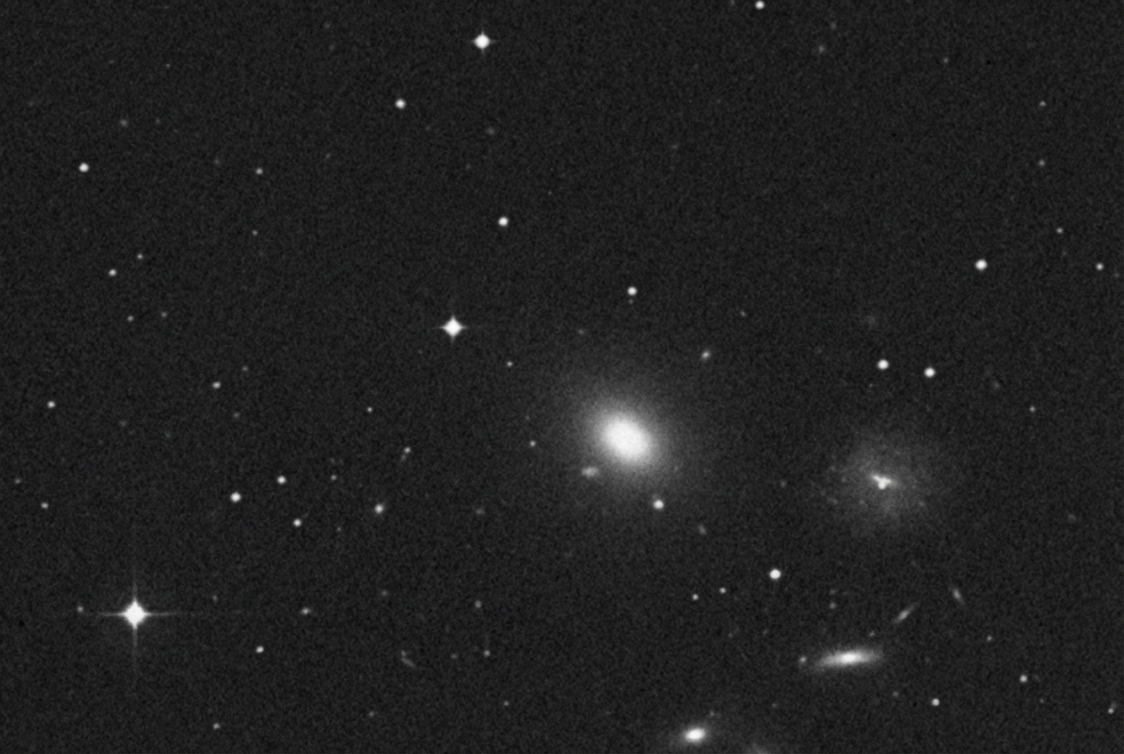 Fig. 4. Cette image isophote de la galaxie NGC 4319 (au centre) et du quasar Markarian 205 (au-dessous), réalisée en superposant plusieurs plaques photographiques prise par Halton Arp à l’aide du télescope de 200 pouces de Palomar, montre clairement les ponts lumineux qui relient les deux objets4. Le Nord est en haut et l’Est à gauche.