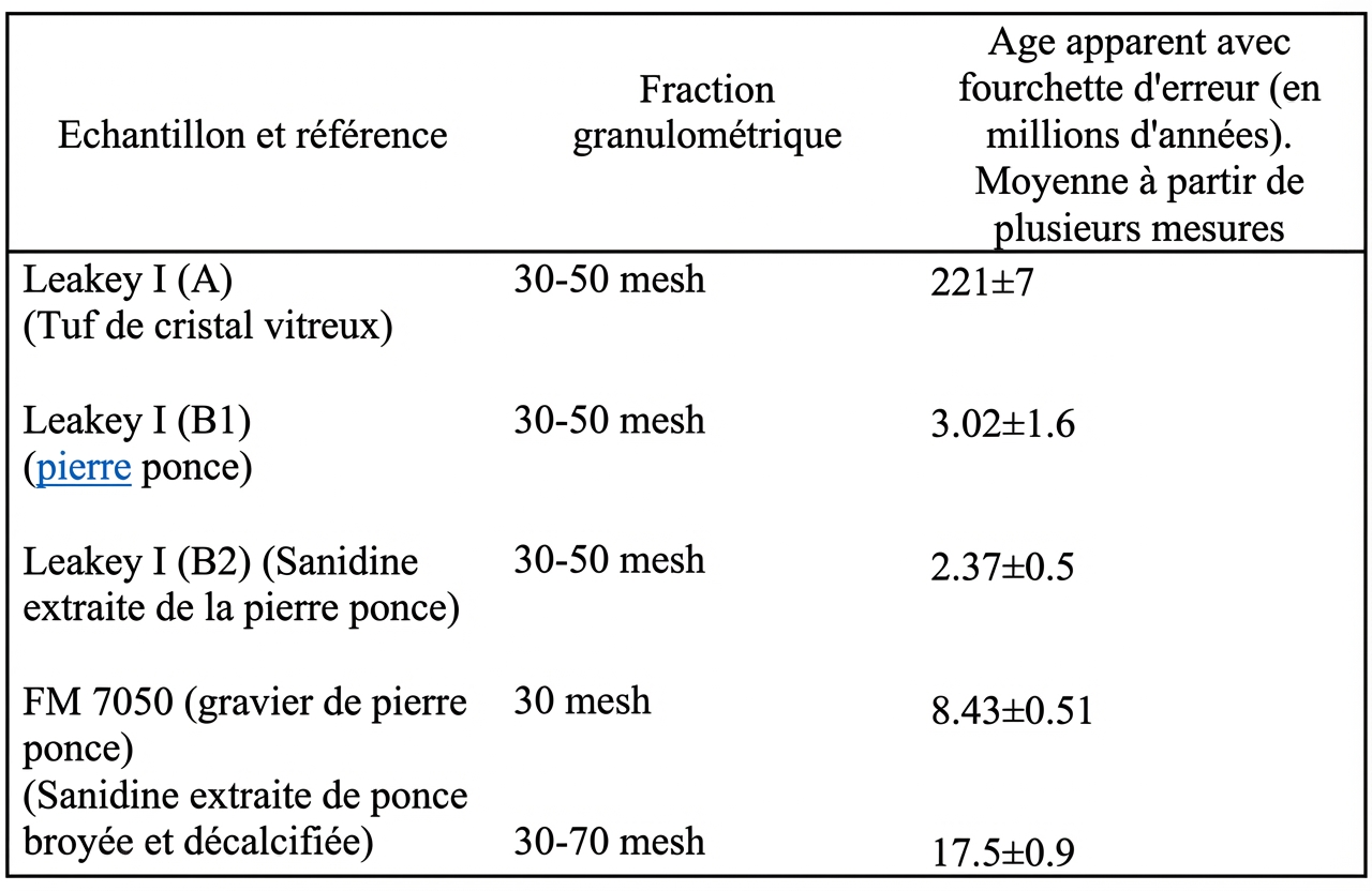Malheureusement, les âges K/Ar obtenus ailleurs sur le même matériau s’avèrent fantaisistes. La plus grande déception vint des découvertes de Koobi-Fora (près du lac Rudolf ou Turkana), où des fossiles semblables associés aux mêmes « choppers » furent officiellement datés sur le tuf K.B.S. d’un âge plus ancien : 2,42 millions d’années. Des dates encore plus anciennes atteignant 221 millions d’années furent également obtenues sur le même tuf, mais ne pouvaient être décemment insérées dans l’échelle d’Holmes (voir tableau 2). Remarquons une fois de plus l’influence de la granulométrie sur l’âge K/Ar « apparent » (selon le mot employé par les géochronologistes eux-mêmes pour qualifier les âges étranges, qui s’éloignent de l’âge attendu pour le fossile et qui disparaîtront des publications officielles) : sur l’échantillon FM 7050, la fraction de sanidine calibrée entre 30 et 70 mesh et décalcifiée a vieilli de 9 millions d’années par rapport au même matériau de départ simplement tamisé à 30 mesh. Affolant ! Et d’autres données, provenant d’études aussi pointues sont encore plus mauvaises, nous le verrons plus loin.