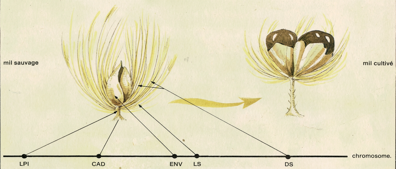 Cela signifie que les lois de Mendel sont applicables à l’ensemble du syndrome de domestication. Si l’on prend un à un chacun des caractères du syndrome de domestication du mil, on s’aperçoit qu’il se présente, sur le plan génétique, comme une alternative à un caractère de la plante sauvage. Par exemple, le long pédicelle (attachant fermement la graine sur l’épi), qui s’observe chez le mil domestique, est remplacé par un pédicelle ultra-court (rendant la graine facilement détachable de l’épi), chez le mil sauvage. L’analyse génétique montre que le caractère long ou court du pédicelle sont les deux versions possibles d’un même gène. Il en va de même pour les autres caractères du syndrome de domestication : un seul gène à deux versions différentes détermine si les graines sont enveloppées ou non ; si les soies sont nombreuses ou non ; si la graine tombe ou non lorsqu’elle est mûre. Pour la longueur des soies, les choses sont un peu plus complexes : deux gènes interviennent en même temps.