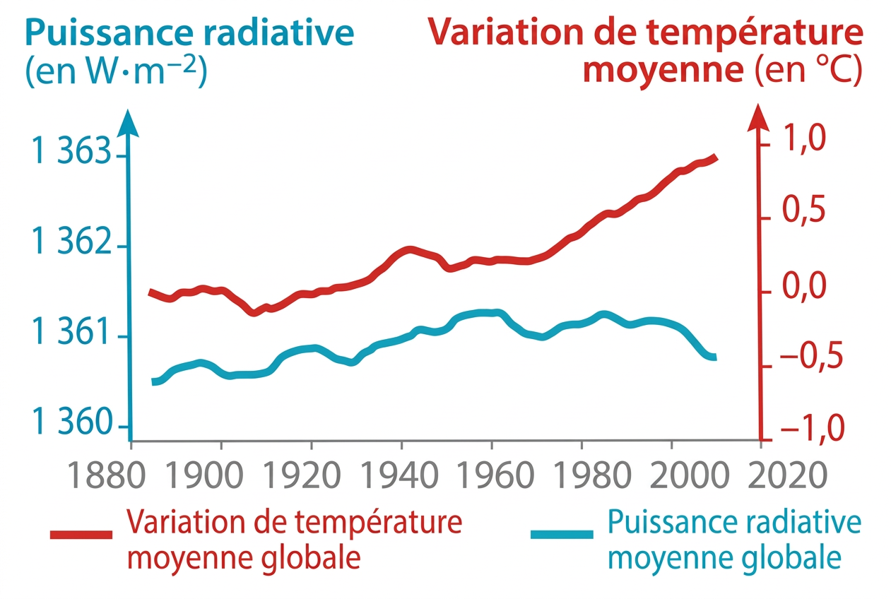 - image1: Graphique représentant la puissance radiative reçue du Soleil et la variation de température de la Terre moyenne