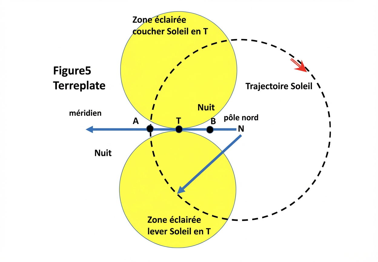 De plus, la frontière jour/nuit devient une circonférence et non un méridien[12]. Le point de tangence T du bord circulaire de la zone éclairée par le soleil avec un méridien verra le lever du jour avant les points A (au sud) et B (au nord) de part et d'autre sur le même méridien, qui seront encore dans l'obscurité (Fig. 6). Pour le point B situé au nord, c'est ce que l'on observe pour un globe. Pour le point A au sud, le lever de soleil devrait se produire plus tôt qu'en T. Or dans le modèle « platiste », il se produit plus tard comme en B (symétrie par rapport au méridien). Le coucher de soleil en T est plus tardif, ce qui est normal pour B au nord, mais anormal pour A au sud (cf. Fig. 6).