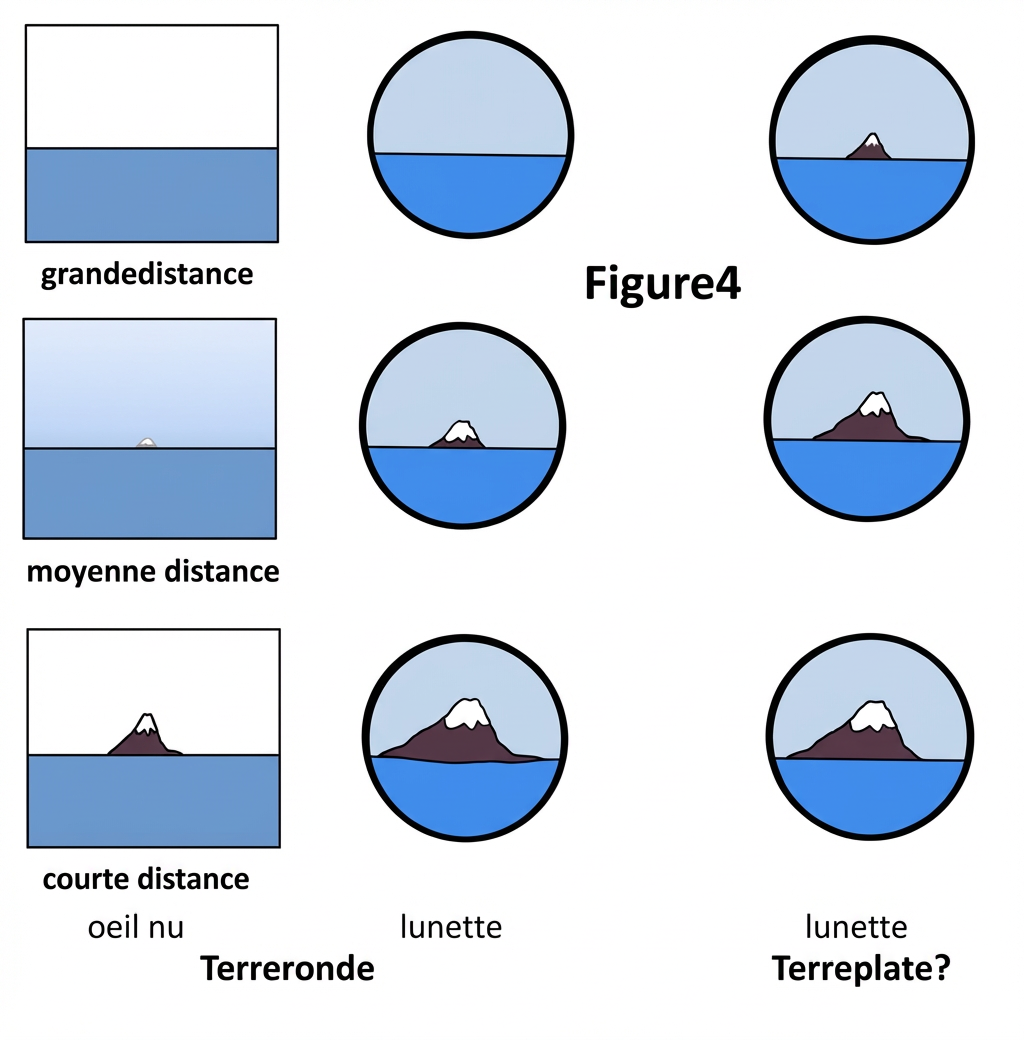 Principale hypothèse des « platistes » : la Terre étant plate, l'observation d'un objet éloigné n'est limitée que par l'effet de perspective et le pouvoir de résolution de l'instrument utilisé (œil nu, lunette, télescope, radar, laser, etc.). Tout objet en ligne directe sans obstacle de relief (par exemple la surface calme de l'océan) serait observable dans son intégralité, quelle que soit la distance, à condition d'utiliser l'instrument adéquat. En revanche, pour une Terre sphérique, la courbure de la surface masque progressivement les objets lointains. La Fig. 4 illustre les deux approches. À faible distance les deux modèles se rejoignent, puisqu'un arc de sphère de faible valeur est assimilable à sa tangente.