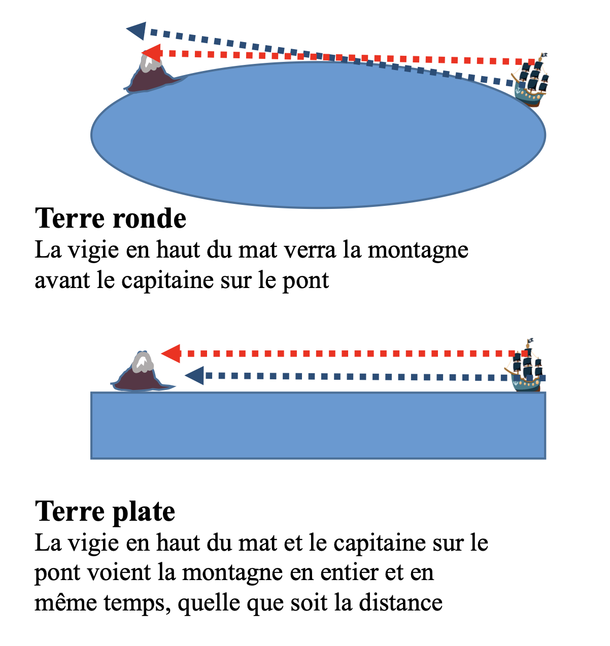 Sinon, Ptolémée II Philadelphe (309-246 av. J.-C.) ne se serait pas donné la peine de faire construire une tour de 135 m de haut sur l'île de Pharos[5] [en grec Φάρος] à l'entrée du port d'Alexandrie (280 av. J.-C.), dont les feux étaient visibles à plus de 50 km ; il faut savoir qu'un feu entretenu à 10 m seulement au-dessus du niveau de la mer n'aurait été visible qu'à 10 km. Une terre plate aurait permis de voir depuis un bateau les feux situés sur le rivage (ou l'inverse) avec une mer calme et de nuit par temps clair, à des distances gigantesques. Les marins du Moyen Âge en savaient autant, puisque les vigies de toutes les marines du monde étaient perchées en haut des mâts sur les nids-de-pie, permettant ainsi de reculer la ligne d'horizon pour apercevoir et identifier les obstacles et autres navires approchants, bien avant les observateurs sur le pont.
