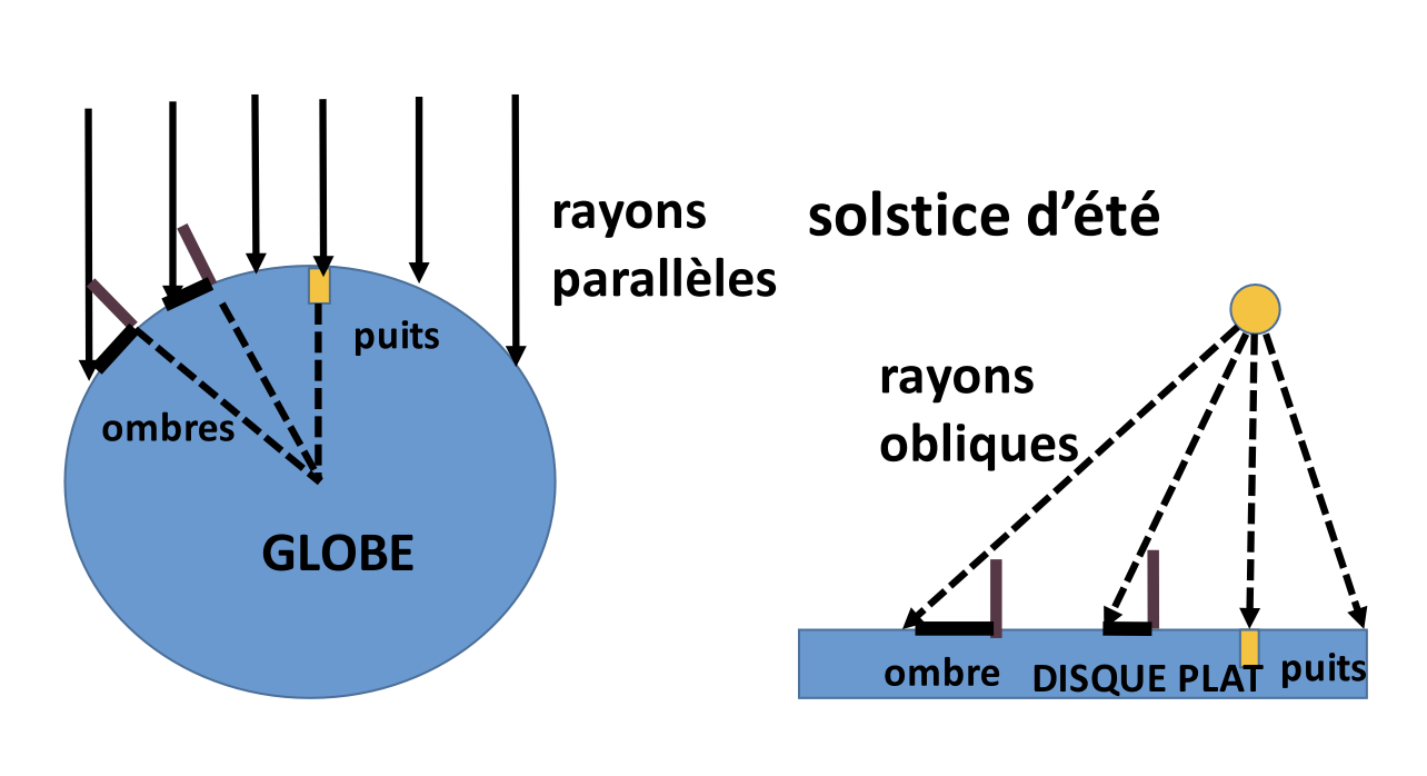 Contrairement à une croyance très répandue, Ératosthène n'a pas prouvé la rotondité de la Terre, mais il l'a supposée et en a extrapolé la circonférence par sa remarquable mesure des ombres portées en deux sites de latitudes différentes situés sur le même méridien. Le choix par les « platistes » d'un soleil de diamètre voisin de 50 km et distant d'environ 5 500 km, qui agit comme une source de lumière ponctuelle (Fig. 2), est conforme aux observations des ombres portées à différentes latitudes ou moments de la journée.
