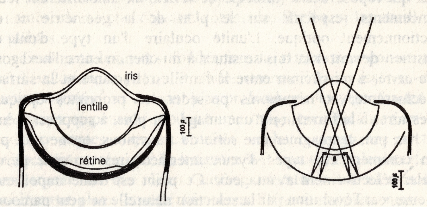 « La face antérieure de la lentille possède une forme assez curieuse : elle est convexe au centre et concave sur les bords, de sorte que sa fonction ne paraît pas tant celle de concentrer les rayons lumineux au niveau du foyer que de corriger un défaut optique présenté par le miroir. Ce dernier, en raison de sa forme, est en effet responsable d’aberrations sphériques, parce que les rayons réfléchis par la région interne du miroir convergent au niveau d’un foyer situé plus à l’extérieur que le foyer vers lequel convergent les rayons émanant des régions externes du miroir. Dans les télescopes astronomiques du type de Schmidt, l’aberration sphérique due à un miroir hémisphérique est corrigée par une lentille mince de faible puissance, appelée la plaque correctrice. De façon remarquable, la lentille de l’œil de la coquille Saint-Jacques semble bien accomplir le même fonction. »