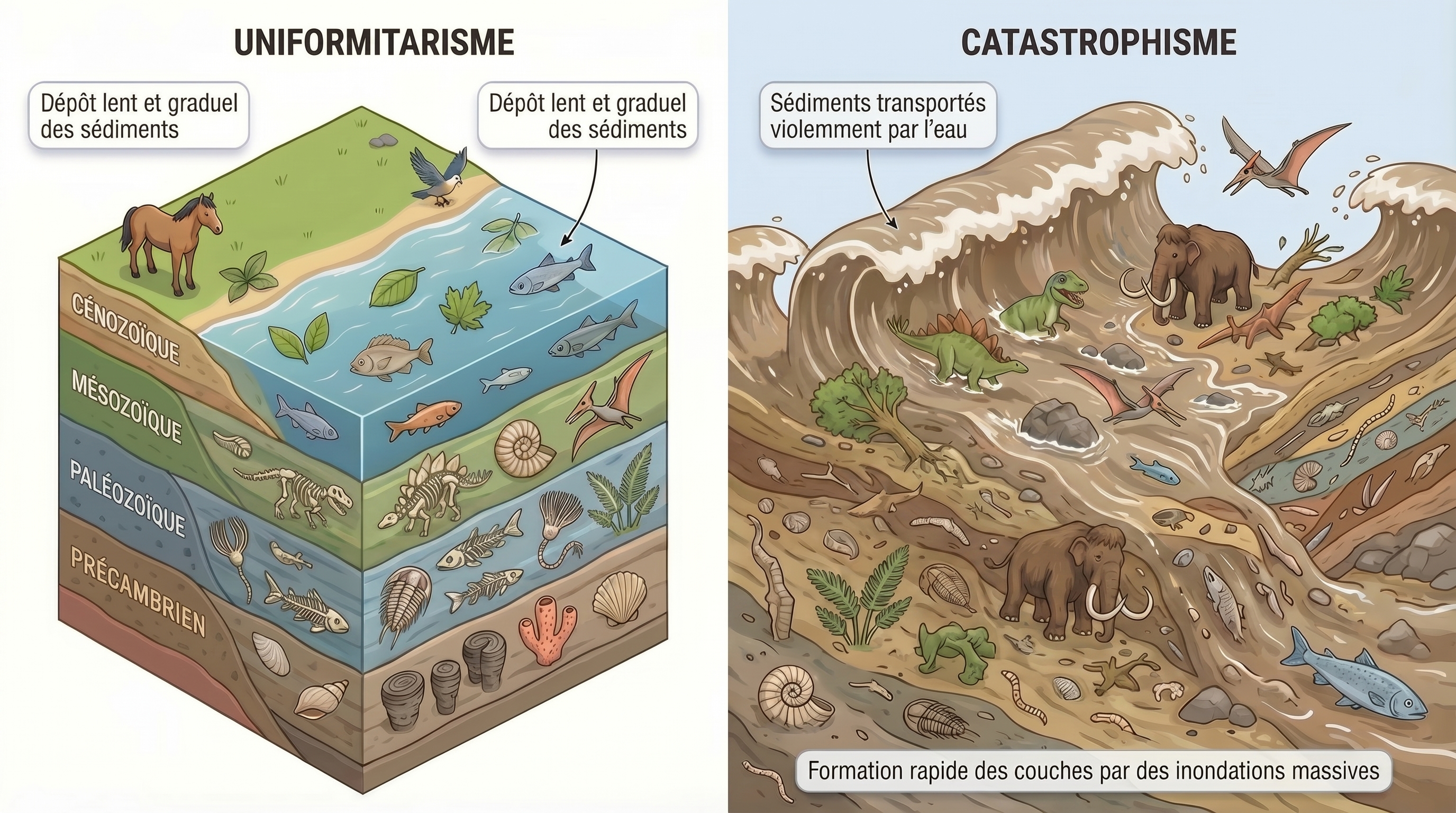 Mais au XIXe siècle, avec Lyell (1817-1875), juriste athée, naît « l'Actualisme » : strates et fossiles ne sont nullement le signe d'une inondation catastrophique, mais résultent tout au contraire des dépôts successifs, opérés à une vitesse lente et uniforme entre deux retraits de la mer. Lyell assure avoir ainsi défini les causes « réelles » (de l'anglais actual, « réel ») de la stratification.