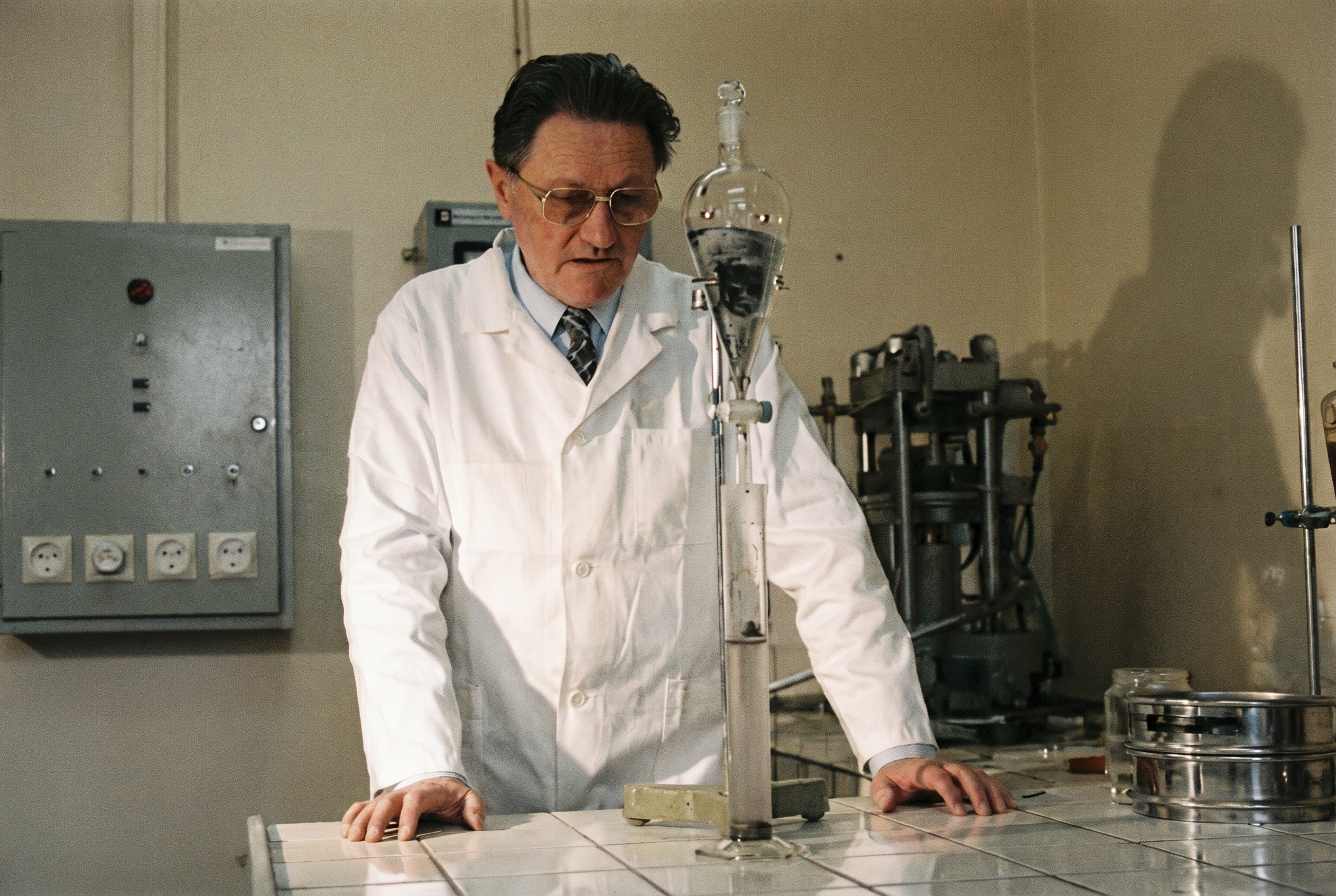 Guy Berthault reproduit ses expériences de sédimentologie en laboratoire pour les besoins du documentaire "Évolution : science ou croyance".