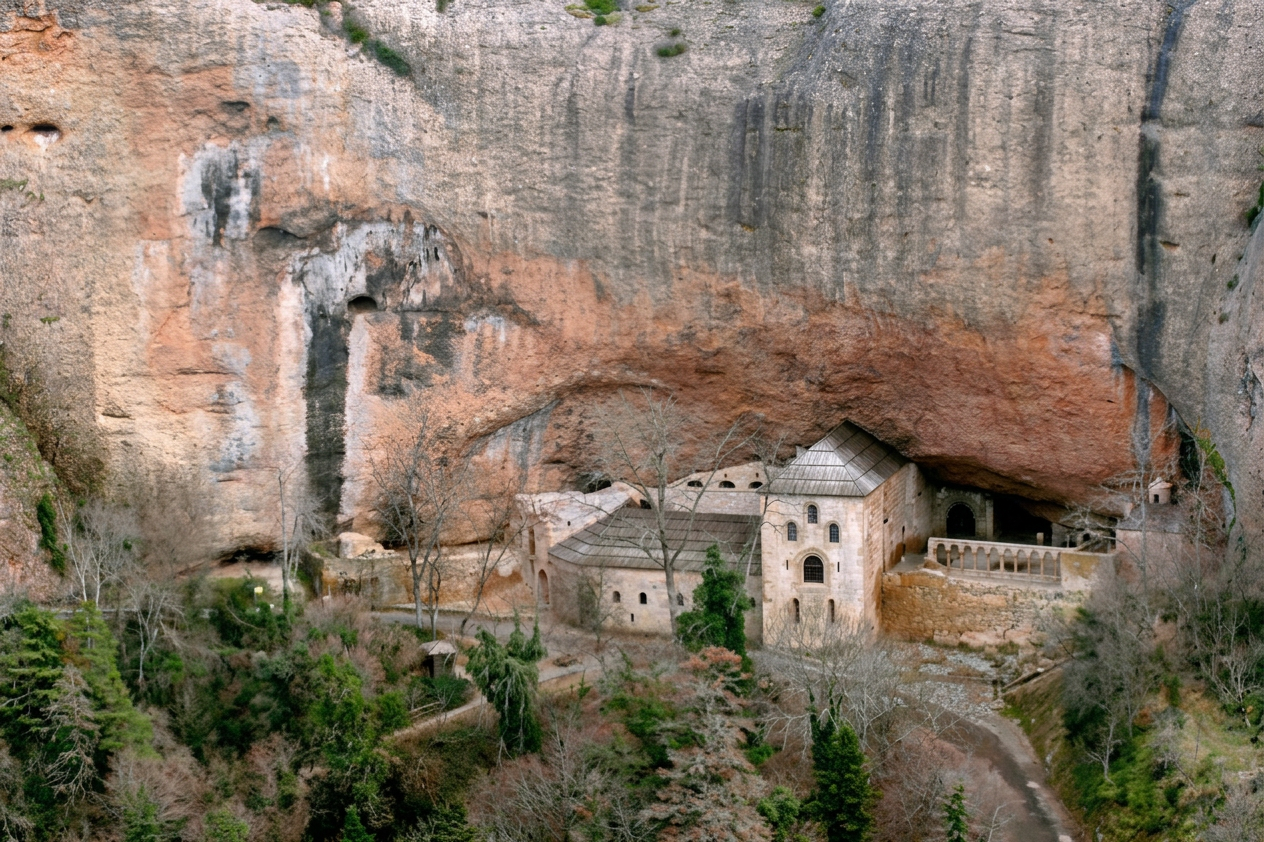 Avant la paix constantinienne9, l’Église eut à souffrir de terribles persécutions, en particulier celles de Dioclétien et de Maximilien, à partir de l’an 303. Dacien, alors gouverneur de l’Espagne, tua dix-huit martyrs à Saragosse, ville située non loin de Huesca, et emprisonna l’évêque Valérien et son diacre Vincent, futur glorieux martyr. Un autre péril sérieux pour le Saint Calice sera l’invasion de l’Espagne par Childebert Ier, qui vola à ce pays pas moins de soixante calices en or ! Enfin, l’invasion musulmane, en 711, nécessitera également la plus grande vigilance, pour mettre en lieux sûrs les biens de l’Église, en particulier ses précieuses reliques, dont celle qui nous intéresse ici. L’évêque de Huesca se réfugia dans les montagnes, emportant avec lui le saint Graal envoyé en Espagne par saint Laurent. La tradition, prise très au sérieux par les savants bollandistes, affirme que le Calice passa par plusieurs lieux dissimulés dans les Pyrénées d’Aragon10, avant d’être recueilli à Saint-Jean de la Peña (monastère roman fondé en 920) : la grotte de Yebra de Basa (ci-conttre), puis Saint-Pierre de Siresa (monastère roman fondé en 833) et Saint-Adrien de Sasabe (monastère fondé à l’époque wisigothique).