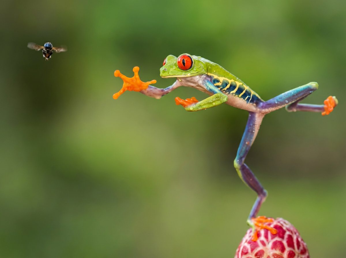 Nous battons tous les records : nous sommes les vertébrés qui sautons le plus loin par rapport à notre taille. [Précision importante : ce ne sont ni la puce ni l’antilope !]. Ma cousine, la Grenouille taureau, peut sauter de 9 à 20 fois sa longueur. Quant à moi, la Rainette (5 cm environ), j’avoue modestement que j’atteins 36 fois ma longueur.