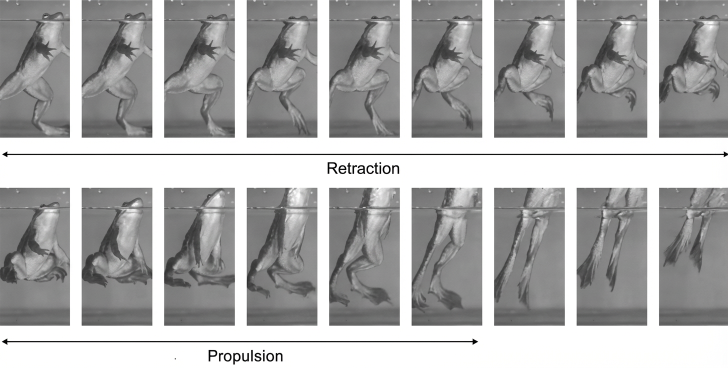 Une étude dela Grenouille léopard (Rana pipiens) indique que la puissance produite durant un saut dépasse parfois celle que le muscle peut théoriquement produire. Lorsque le muscle se contracte, l’énergie est tout d’abord transférée vers le tendon étiré qui entoure l’os de la cheville. Ensuite, les muscles s’étirent à nouveau tandis que dans le même temps le tendon libère son énergie telle une catapulte afin de produire une puissance d’accélération dépassant les capacités musculaires.