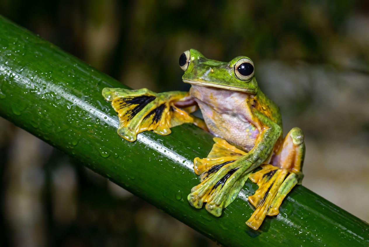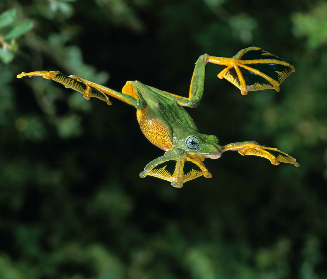 Mes cousines qui possèdent des pattes avant et arrière palmées, par exemple Rhacophorus reinwardti, la grenouille volante de Java, peuvent planer dans les airs.