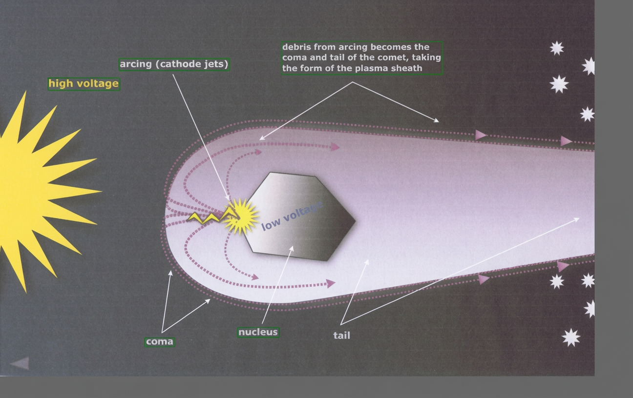 Les décharges des arcs cathodiques sur le noyau produisent les cicatrices noires caractéristiques de ce genre de décharge (comme dans l’électrophorèse utilisée par l’industrie), produisant des cratères, mesas, terrasses. C’est pourquoi les noyaux des comètes sont les corps les plus sombres de tout le système solaire. Le diamètre de la chevelure visible atteint souvent plusieurs millions de kilomètres et c’est la force électrique, non la gravité, qui permet au noyau de la maintenir en place pendant qu’il tourne autour du soleil. La chevelure est elle-même entourée par une enveloppe « improbable » encore plus vaste faite d’hydrogène fluorescent visible en ultra-violet. La grande différence entre la surface des comètes et celle des astéroïdes est que les arcs électriques et le « nettoyage électrostatique » ne laissent aucun débris ni poussière sur le noyau de la comète.