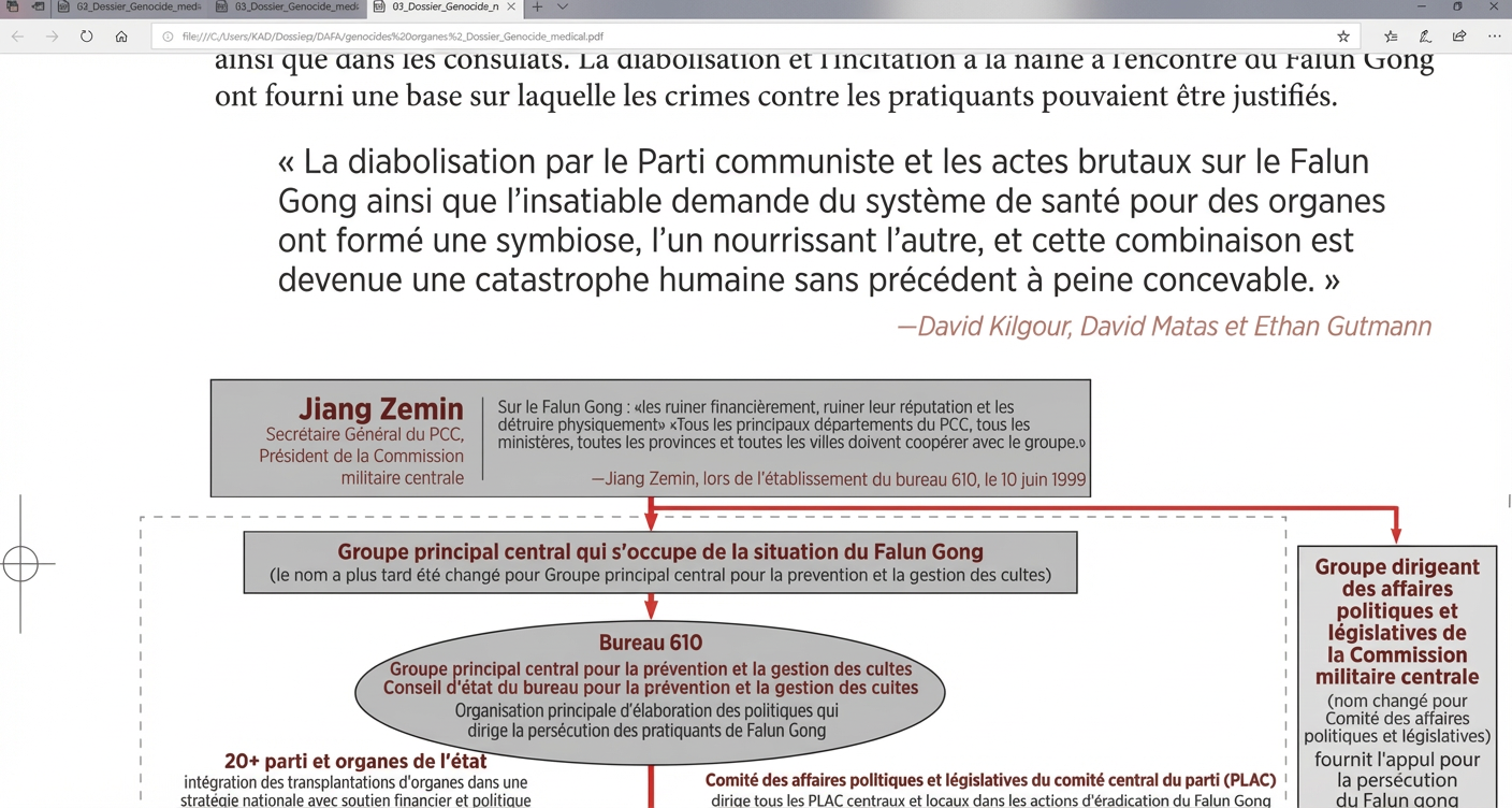 « À travers la Chine, un commerce révoltant d’organes humains s’est développé à grande échelle. Comme dans un film d’horreur, des foies, des reins, des cœurs, des poumons et des cornées sont prélevés sur des prisonniers d’opinion alors qu’ils sont encore en vie. S’il existe dans ce monde quelque chose qui serait le modèle de l’expression “crime contre l’humanité”, c’est bien cette pratique macabre et sanglante. »