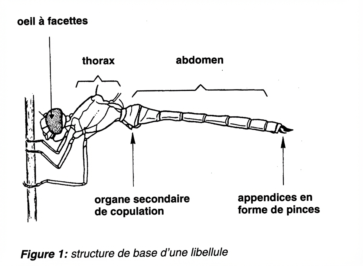 Comme chez tous les insectes, notre corps se compose de trois parties : tête, thorax et abdomen (figure 1). Notre structure, pourtant, présente de multiples particularités parfaitement adaptées à notre mode de vie et spécialement à notre technique de vol. Remarquez notre abdomen, fin comme une allumette et semblable à un balancier. Il stabilise notre vol et abrite nos systèmes digestif et reproducteur. La structure segmentaire et la peau qui sert de liaison assure à notre abdomen un maximum de souplesse et une surprenante agilité. Semblable à l’armure d’un chevalier, chacun des segments est formé de dures brides pectorales et de solides plaques dorsales.