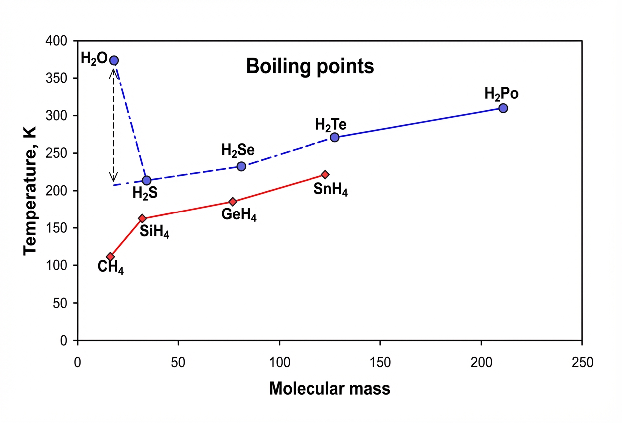 Fig. 3 : Températures d’ébullition de quelques liquides en fonction de leur poids moléculaire. L’extrapolation de la courbe aurait donné Te=-80°C (donc au-dessous de zéro) pour l’eau. Il n’y aurait alors que de la vapeur d’eau sur la terre, et toute forme de vie serait impossible.