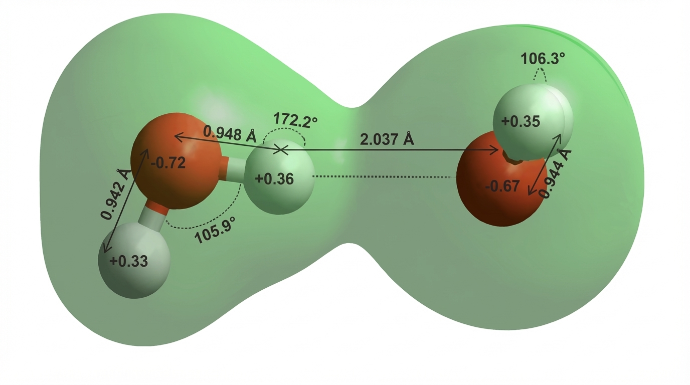 Fig. 4 : Modèle de dimère avec la liaison hydrogène, entre l’atome d’hydrogène de la molécule d’eau (à gauche du dessin) et l’atome d’oxygène de la molécule d’eau adjacente (à droite). L’angle H-O-H du monomère (1 molécule d’eau isolée) peut varier de 104,5° à 109,5°. Dans le dimère présenté ici, l’angle vaut 105.9° pour la molécule fournissant l’atome H, 106,3° pour la molécule fournissant l’atome O. La distance de centre à centre H-O de la liaison hydrogène n’est que de 0,2 nm.