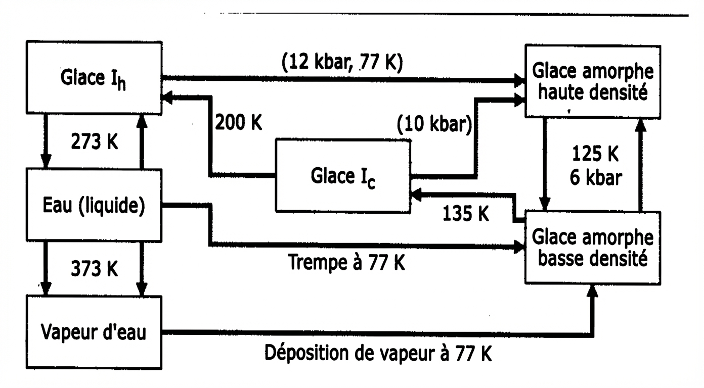 L’exploration d’une gamme plus large de températures et pressions a mis en évidence plus de 15 formes différentes de glace cristalline et 3 formes amorphes. Par exemple, on trouve une glace amorphe plus lourde que le liquide et de densité 1,17 à T=-146°C et P=1,2 GPa4.