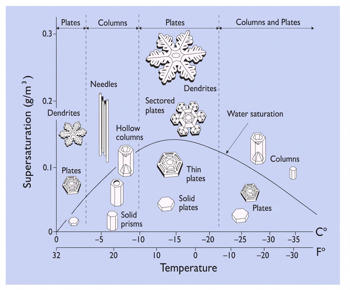 Fig. 1: Variétés possibles de cristaux de glace (Glace « ordinaire » hexagonale)
