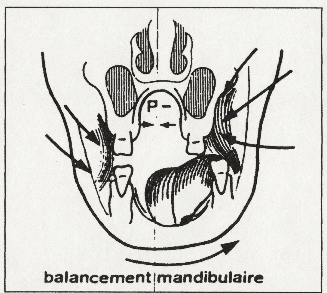 La mandibule se trouve pendue au crâne, telle une balançoire à un portique. Ses mouvements d’ouverture et de fermeture peuvent être assimilés aux balancements de la balançoire avec toutes les perturbations qu’un défaut de sustentation du portique peut déclencher. Si le portique n’est pas d’aplomb, la balance oscille de travers. Il en est de même si le port de la tête est légèrement perturbé, la mandibule peut fermer de travers et trouver ainsi des contacts prématurés lors de son chemin de fermeture, ce qui engendre un déséquilibre temporo-mandibulaire.