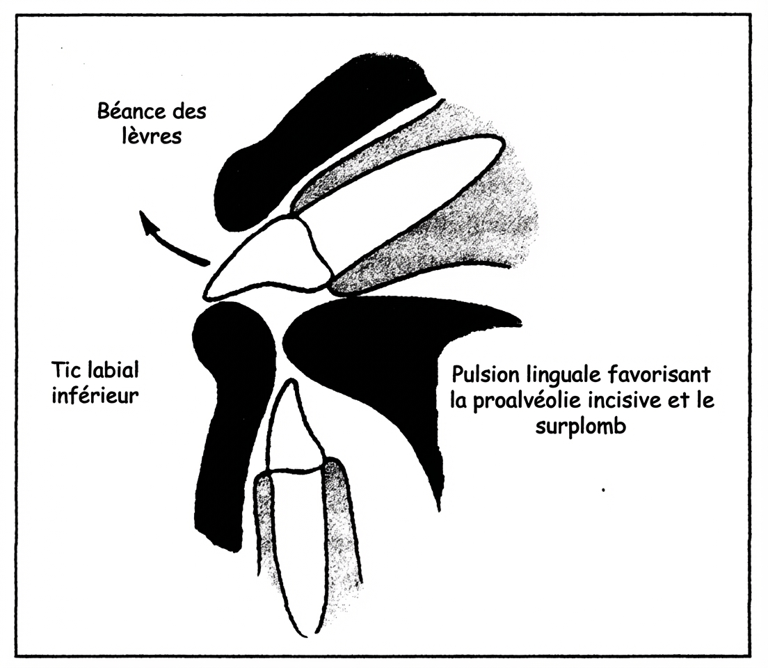 Chez un sujet jeune, la succion du pouce, en particulier, mais aussi l’interposition d’une langue et sa succion, vont provoquer le recul de la mandibule en freinant sa croissance vers l’avant. La hauteur d’occlusion va se trouver affaissée et la tête va alors s’incliner, ce qui induira des cervicalgies à l’âge adulte lorsque les troubles seront fixés à l’issue de la croissance. La correction par orthopédie de ces troubles, en repositionnant la mandibule, va immédiatement redresser le port de la tête et parfois libérer l’enfant de certains troubles secondaires comme une nervosité mal contrôlée, une énurésie, des tics. Il s’épanouit et les études graphologiques sur ce sujet le prouvent10.