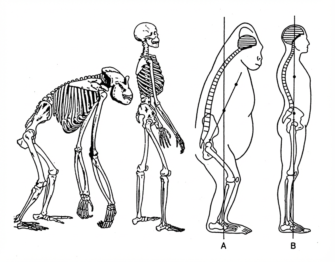 Cette posture bipédique ne peut pas être issue de la posture quadripédique à partir d’une surrection progressive du supposé ancêtre de l’homme sur ses deux pattes, comme l’affirment les évolutionnistes. Cette surrection chez les quadrupèdes se fait déjà douloureuse lorsqu’elle dure quelques instants, car tout leur système tonique postural, qui n’est pas du tout adapté pour cette position, va se mettre en tension pour maintenir ce nouvel équilibre.