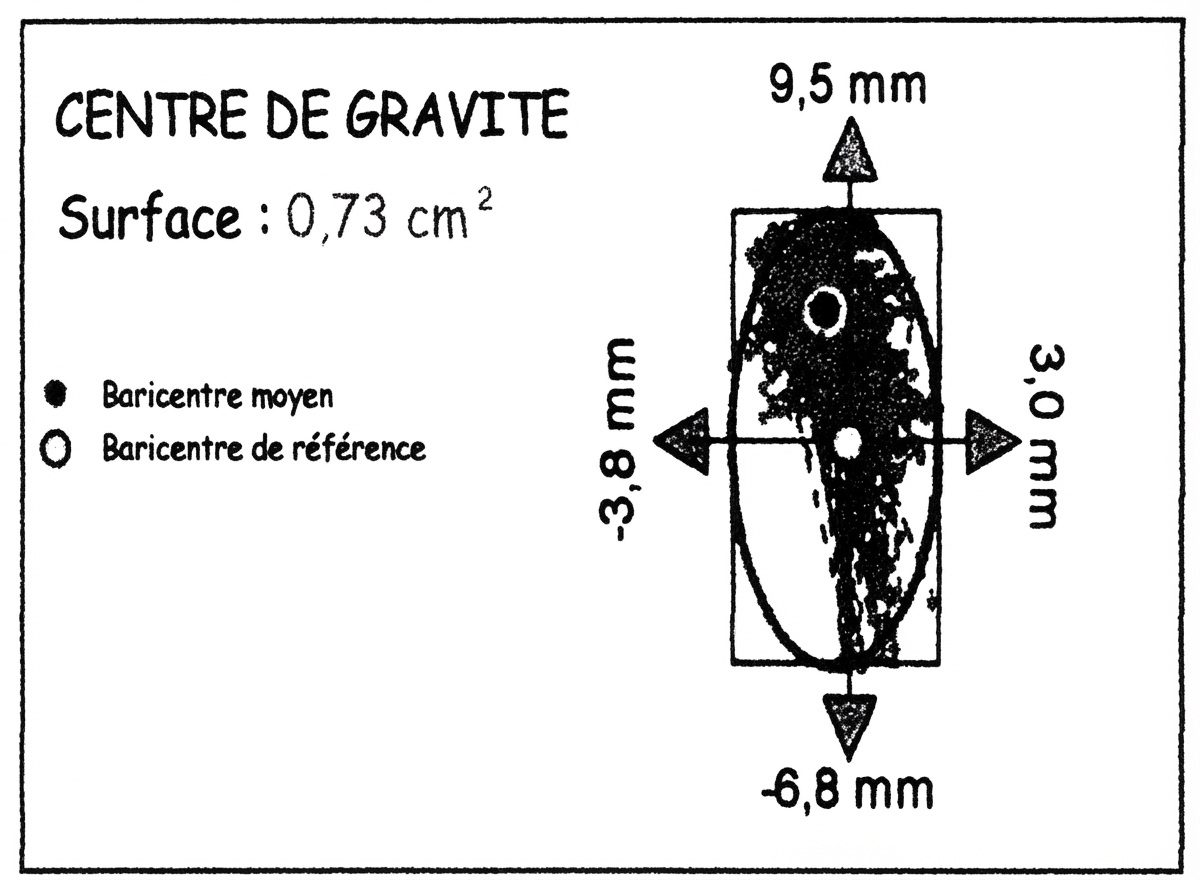 Examen stabilométrique avec gouttière entre les dents : le centre de gravité se trouve recalé