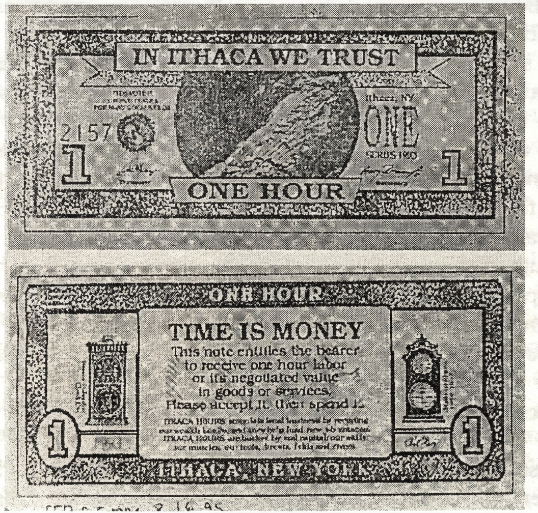 Paul Glover explique comment cela fonctionne : « Le billet de base, l’Ithaca hour, vaut 10 dollars, ce qui représente en gros le salaire horaire moyen payé dans cette ville. Prenons maintenant un fermier qui vend pour 20 dollars de fromage. A la place de la monnaie nationale, il reçoit donc deux heures de travail gratuit. Avec ce petit capital, il achète par exemple les services d’un menuisier qui lui-même fait appel au savoir-faire d’un mécanicien, lequel l’utilise pour payer son chiropracteur, qui lui se sert de ces billets pour s’offrir quatre places de cinéma, et ainsi de suite. C’est un système sans fin qui grandit de lui-même, une économie écologique, en vase clos, qui s’écarte du dollar et où le temps de travail réel remplace les liquidités abstraites« . A Ithaca, en effet, on peut maintenant se procurer presque tout : des consultations médicales, des services divers, des spectacles, des dîners, des meubles, etc.